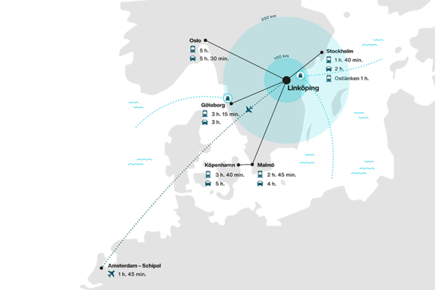 Det är lätt att ta sig till eller från Linköping och ut i världen. Faktum är att Linköping har ett perfekt läge tillsammans med Norrköping. Östergötland har ett av landets bästa lägen för kommunikation och transport, ett geografiskt drömläge mitt i Sverige och mitt emellan Sveriges två största städer. Inom en radie av 30 mil från Linköping når du 80 procent av Sveriges samtliga aktiebolag.