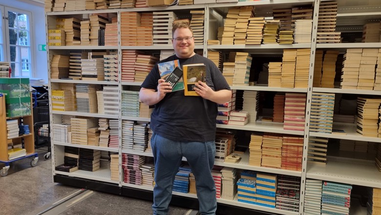 Bild på Jacob Andersson i läromedelsdepån.