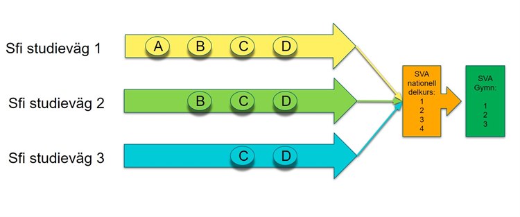Efter sfi D kan du fortsätta läsa svenska som andraspråk nationell delkurs 1-4. Därefter kan du fortsätta läsa svenska på gymnasienivå.