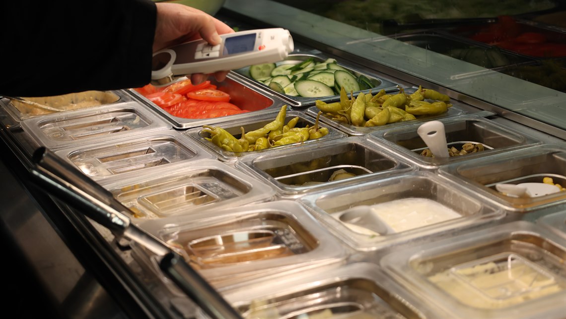 – Det är ganska hög temperatur här, säger Thérése till mannen som tillreder maten, och håller fram en termometer där det finns byttor med grönsaker och såser.