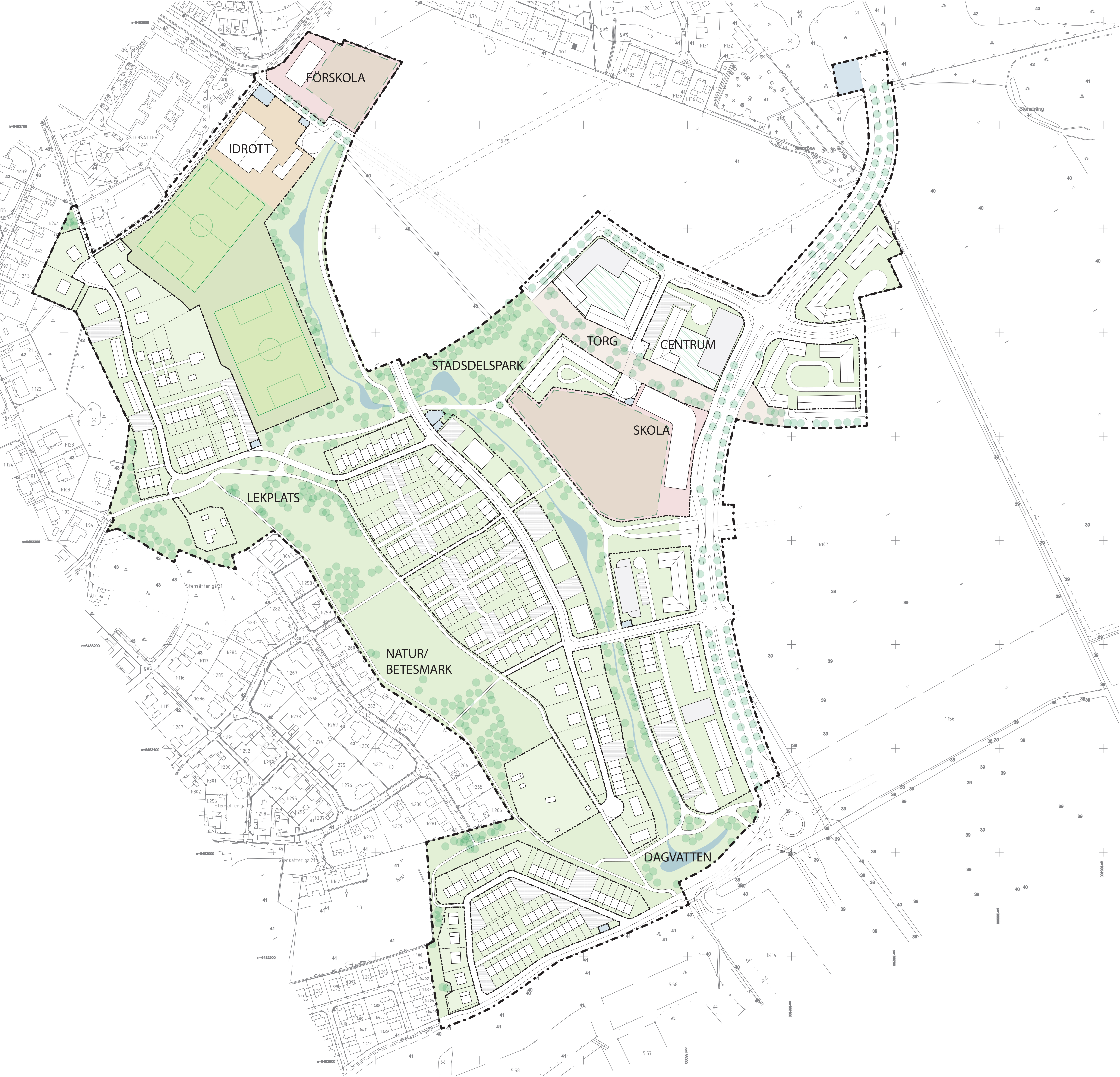 Förslaget innehåller en ny huvudgata (uppsamlingsgata) för fordonstrafik som leder genom området i nord-sydlig riktning. Inriktningen är att de föreslagna flerbostadshusen ska placeras utmed huvudgatan och kring centrumet, som är placerat mitt i området. Vi föreslår att de föreslagna enbostadshusen placeras i de västra och sydvästra delarna av området.