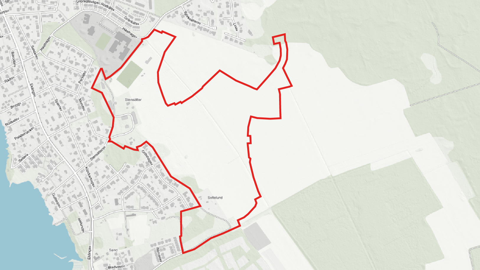 Det aktuella förslaget för detaljplanen Stensätter 1:107 med flera gäller för den västra delen av området. Se röd markering i kartan.