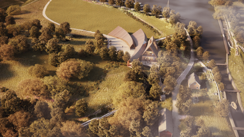 Illustration av hur besökscentrumet kan gestaltas. Den nya byggnaden placeras på den redan ianspråktagna gårdsplanen och följer landskapets/drumlinens form mot söder. Illustration Tengbom.