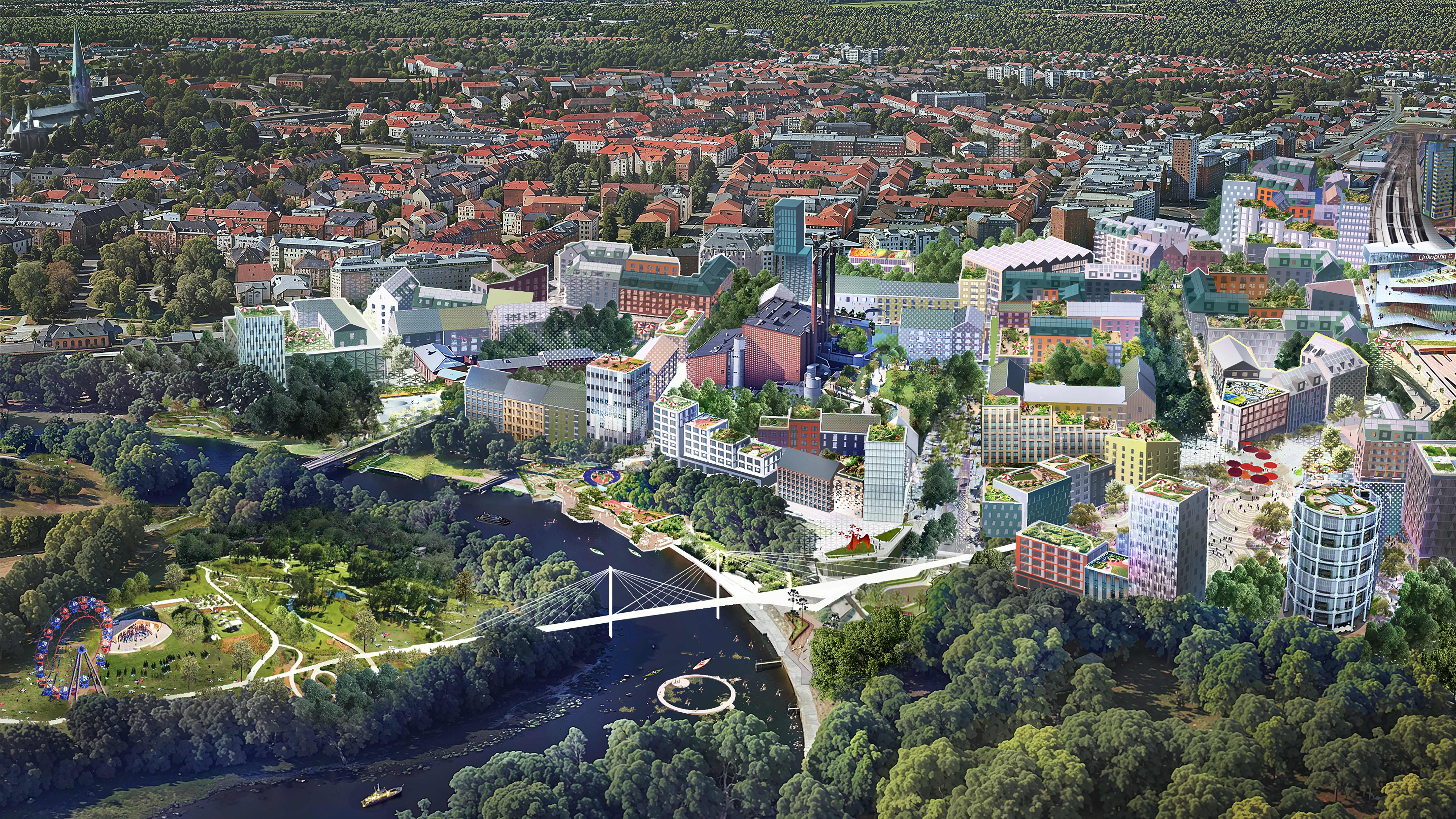 Bild som visar hur området mellan den nya centralstationen och innerstaden kan utformas de kommande decennierna. Dagens innerstad växer på sikt samman med det nya stationsområdet. Den nya centralstationen ligger längst till höger i bild, i mitten är kraftvärmeverket och Stångån sett från Stångebro. I det övre vänstra hörnet syns Domkyrkan. Klicka på bilden för att se den i större format.