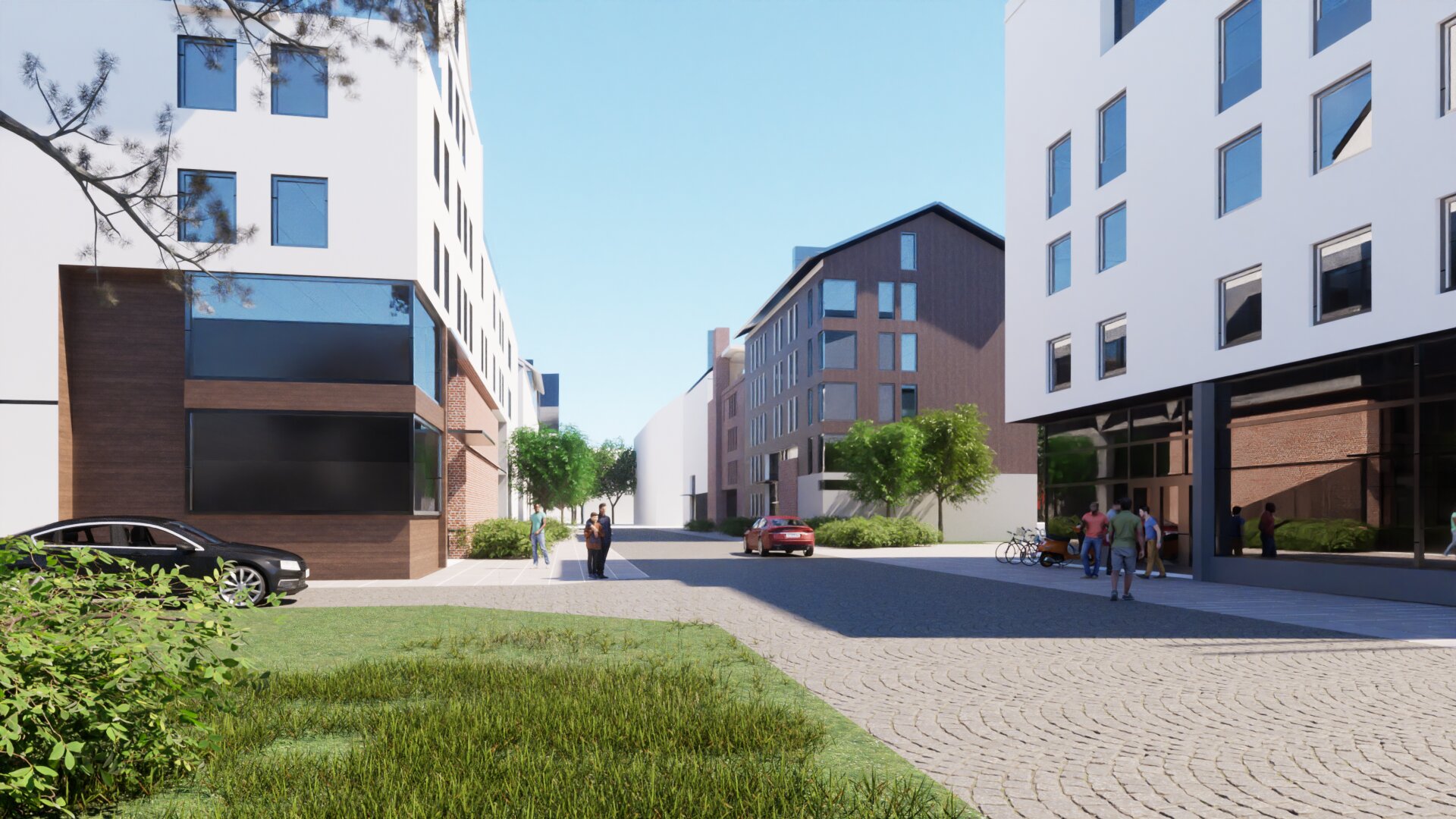 Illustration över lokalgatan som går i väst-östlig riktning genom detaljplaneområdet. Verksamhetslokaler i bottenvåning och bostäder i de övre våningsplanen. Winell och Jern 2023-06-16