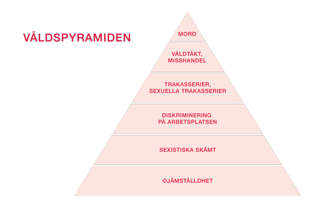 Mäns våld mot kvinnor är som en pyramid. Längst upp i toppen finns det yttersta våldet. Toppen vilar sedan på en grund av ”mindre allvarliga”, men mer vardagligt förekommande företeelser, som till exempel ojämställda beteenden och sexistiska skämt *.