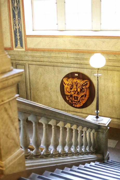 Trärelief av Gunnar Kanevad i trappan upp från entrén i Stadshuset. Foto: Fanny Miles.