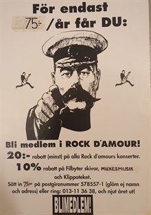 Att värva medlemmar till föreningslivet är inte det lättaste. Med denna mycket direkta uppmaning gjorde rockföreningen Rock d´Amour ett entusiastiskt försök för ca 30 år sedan.
