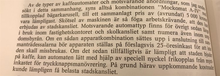 Drätselkammarens arbetsutskott fick alltså i uppdrag att bereda frågan. I slutet av november togs frågan åter upp och där beslutades att ge i uppdrag åt biträdande kanslichef L.G. Pedersén att närmare utreda om det var möjligt att installera en kaffeautomat i stadshuset. Han konstaterade att lokalerna i stadshuset var alltför splittrade och kunde inte tillgodose både personalens och sammanträdesdeltagarnas kaffebehov samtidigt. Kaffekokningen för personalen hade redan lösts i annan ordning. Pederséns förslag för sammanträden var en automat som inte skulle kräva så mycket tillsyn, men ändå leverera kaffe när som helst. Den behövde vara av mynttyp.