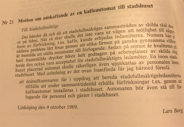 Den 9 oktober 1969 skickade stadsfullmäktiges andre vice ordförande Lars Borg in en motion till fullmäktige om att införskaffa en kaffeautomat till stadshuset. Han hade sett behovet då stadsfullmäktiges sammanträden “av skilda skäl drar ut på tiden”. Det skulle då vara bra om ledamöterna kunde erbjudas någon form av förfriskning.