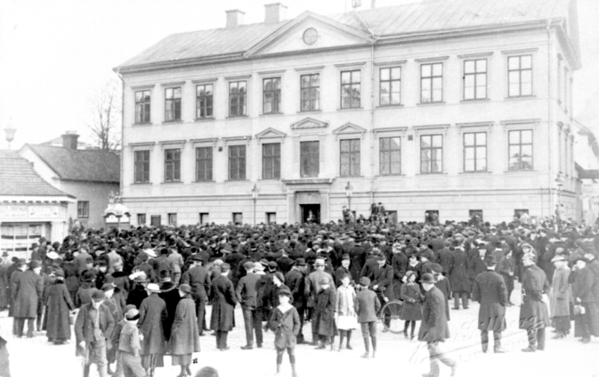 Folksamling vid en bröddemonstration utanför Linköpings rådhus, 1916. Bild: Jonas Gillberg/Bild Linköping