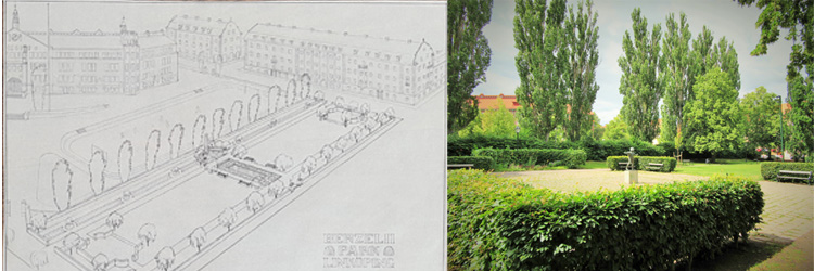 Skiss av förslag till Berzeliipark ritad av Axel Brunskog samt en bild på hur det ser ut idag. Bilder: Linköpings stadsarkiv