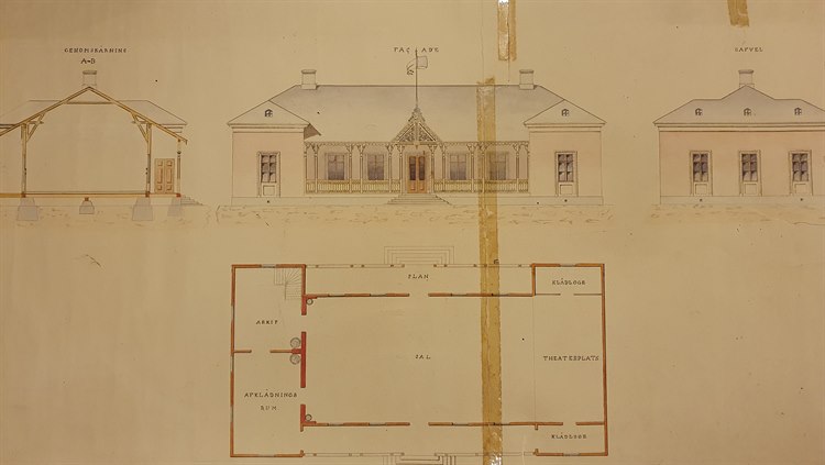1875 års bygglovsritning. Året efter stod huset klart, ännu bara med ett våningsplan. Bild: Linköpings stadsarkiv