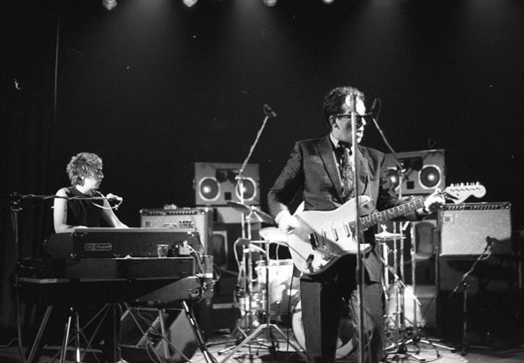 Elvis Costello uppträder med sitt band, 1980. Bild: Loke Hallberg