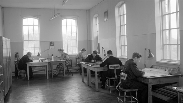 Interiör från ritningskontoret på Maskinskyltfabriken 1953. Bild: Sven Källberg/Östergötlands museum