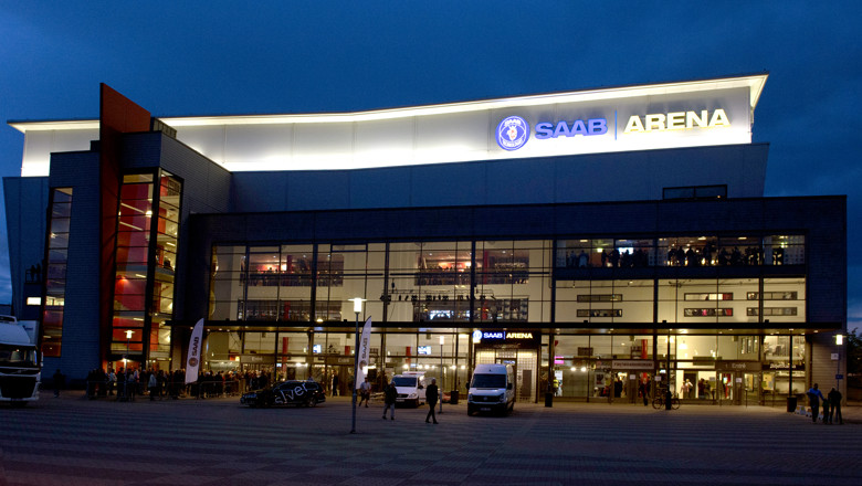 Kvällsbild på huvudentrén till Saab Arena i Linköping