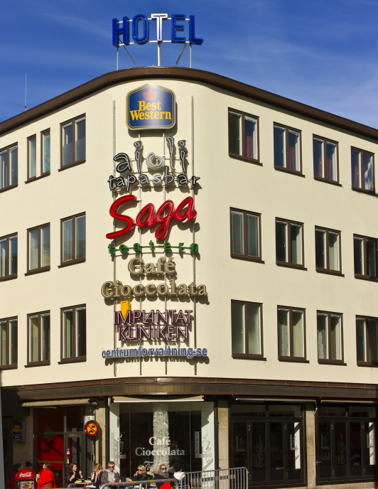 I Stora torgets nordöstra hörn ligger Sagahuset, även känt som före detta Hotell Baltic. Det är ritat av samme Rickard Gavel som formgav Centrichuset och är lika funktionalistiskt elegant. Lägg särskilt märke till hörnets grafiska presentation av byggnadens näringsidkare – livfullt men ändå estetiskt sammanhållet.