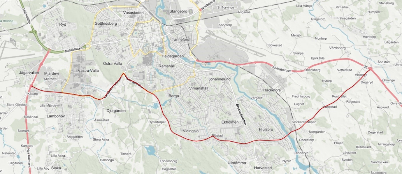 Främsta sträcka Vårdsbergsvägen - Vistvägen - Haningeleden - Lambohovsleden (se bild)