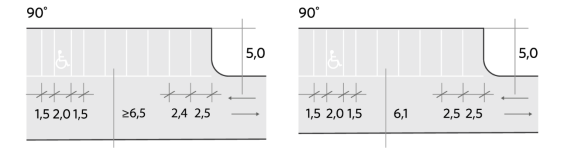 Snedställda parkeringsplatser utformas enligt mått i VGU, se figur nedan. Risken med backrörelser i trafikmiljö ska alltid beaktas vid val av parkeringsutformning. Längs gator ska i första hand längsgående parkering användas.