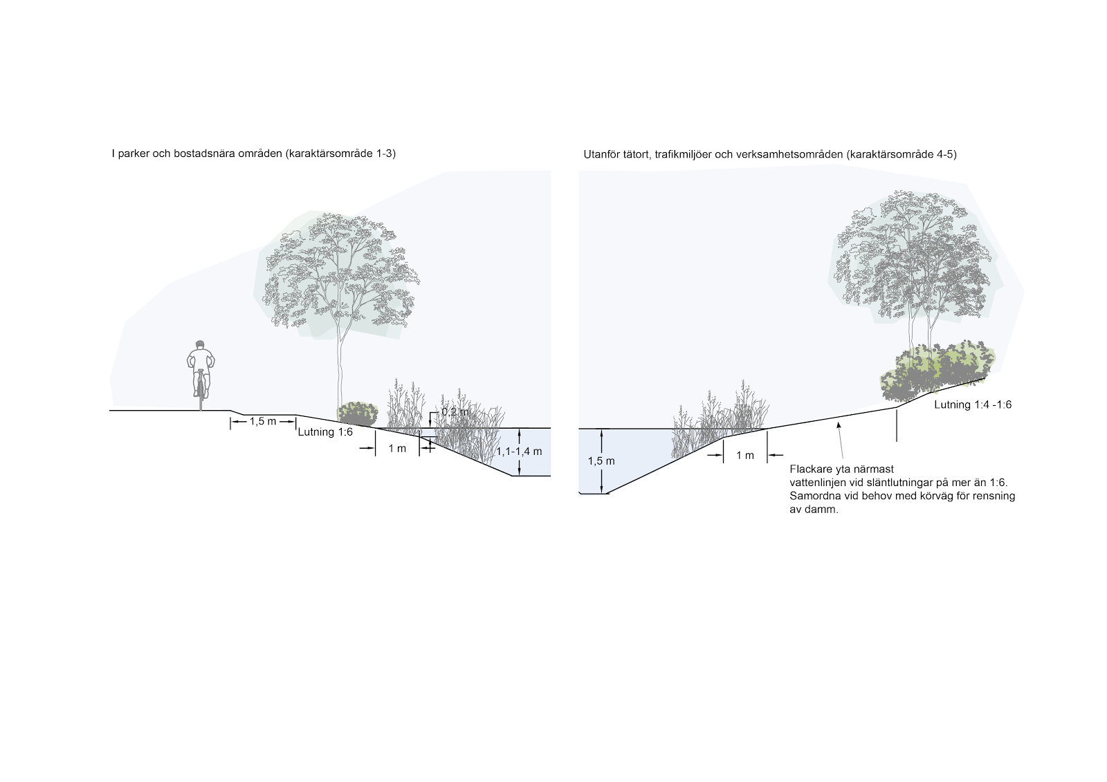 - Släntlutningen bör inte vara större än 1:6. Slänter kan planas ut närmast vattenlinjen i anslutning till platser där barn leker.